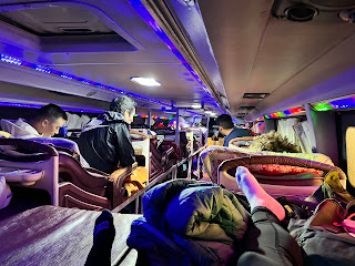 Als der Bus nach 1.5h Verspätung eintraf, waren fast alle Plätze schon besetzt. Die “normalen“ Schlafplätze - also Liegestuhl ähnliche Liegen - waren rein für die Vietnamesen reserviert, während die Touristen hinten im Bus nebeneinander liegend auf zwei Plattformen (1 Männer, 1 Frauen) liegen mussten. Positiv gesagt, wir lernten die Schweizerin, die wir im Warteraum trafen, sehr schnell sehr viel besser kennen. Und auch die beiden Schwedinnen waren ab der Lage so überfordert, dass sie nur noch lachen konnten (wir übrigens auch). Bei einer Vollbremse wären wir im Kollektiv durch den ganzen Bus geschlittert. In den acht Stunden Fahrt war Schlaf somit also eher rar.